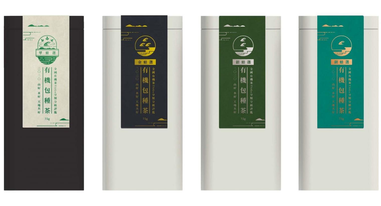 在有機茶評選進入第二個年頭的2018年,團隊捨棄第一屆較為抽象的「包」字線條,直接將分級的樹蛙徽章秀在包裝上,並改採用棉紙材質,整體質感升級、視覺上更加直觀,得獎茶款銷售的速度更是加倍!